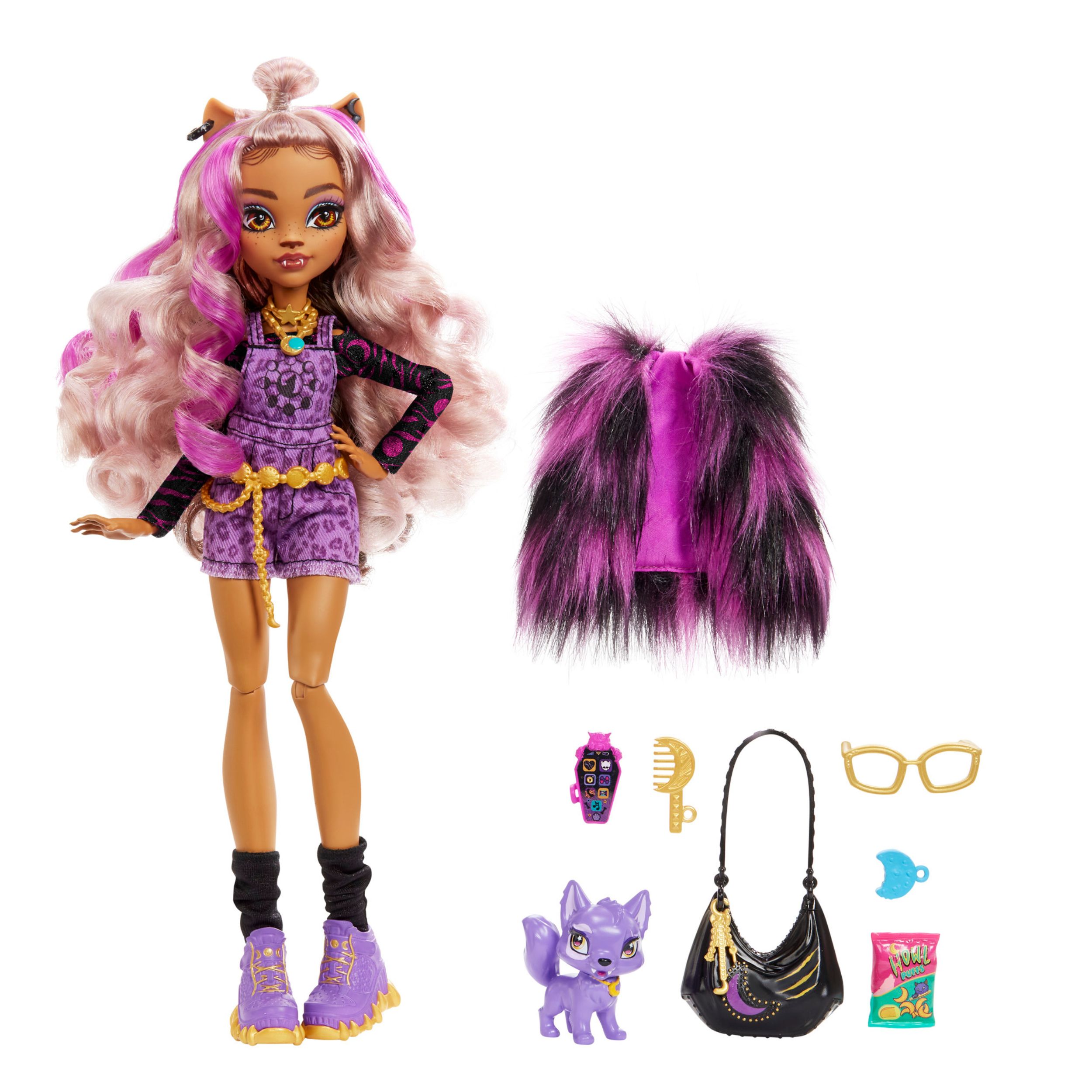 Clawdeen se šeće Monster High hodnicima u pandžastome stilu s džemperom sa životinjskim printom i majicom dugih rukava s uzorkom polumjeseca. Njen otkačen izgled inspiriran vukodlacima upotpunjen je jezivim tenisicama, crnom torbicom, zlatnim naočalama i nakitom. Podignite izgled lutke Clawdeen Wolf na višu razinu s opakim prslukom od umjetnog krzna i zastrašujućim šik dodacima.