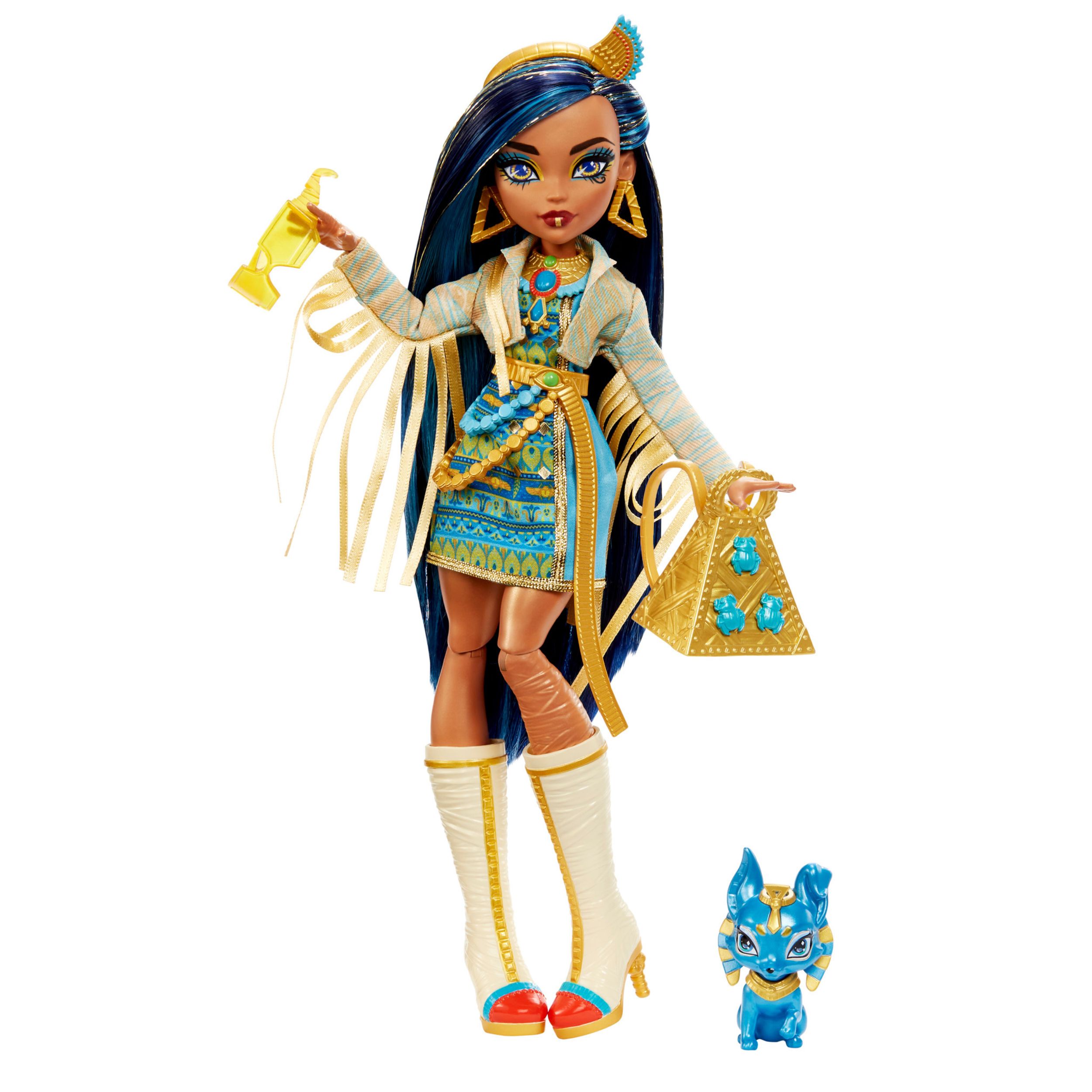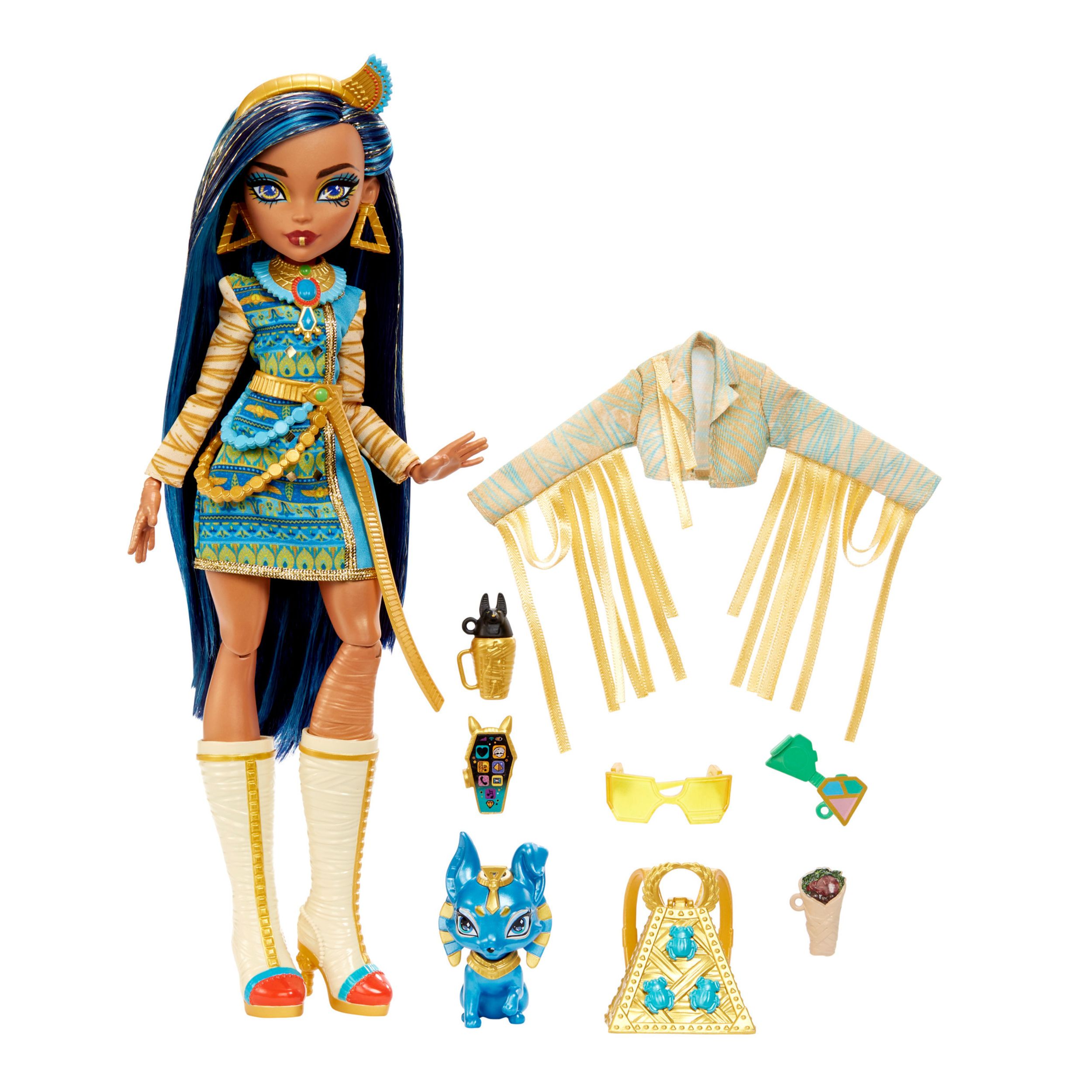 Cleo se šeće Monster High hodnicima u kraljevskom stilu s kraljevsko plavom haljinom s rukavima inspiriranim omotom od mumije i remenom. Njen zastrašujući-šik izgled upotpunjen je visokim čizmama, ruksakom u obliku piramide sa skarabejima i zlatnim dodacima. Podignite izgled lutke Cleo na višu razinu s čudno-tastičnom jaknom s resicama i dodacima.