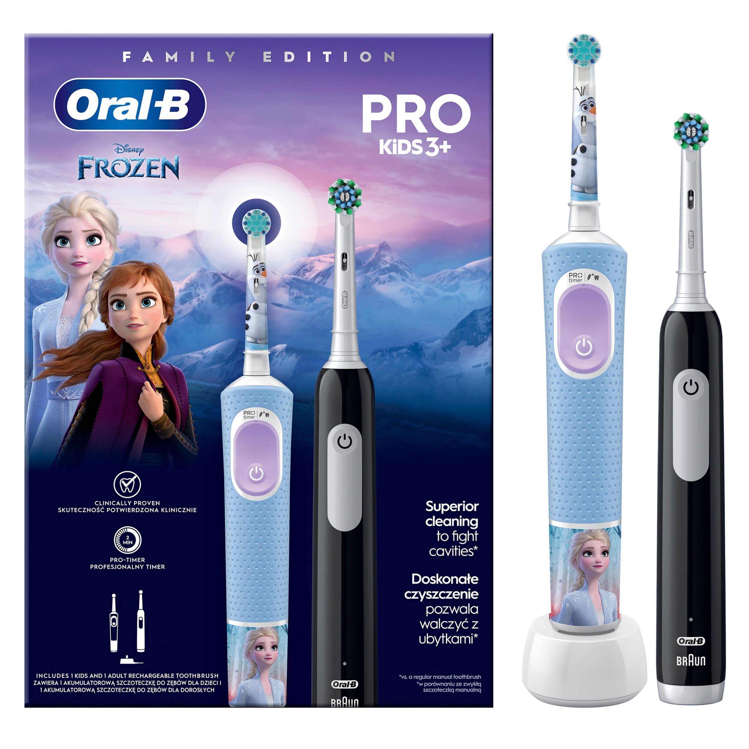 • Oral-B Family Edition, Pro Series1 + Kids 3+ Frozen obiteljski paket uključuje jednu električnu četkicu za zube Oral-B Pro Series 1 za odrasle i jednu Oral-B Pro Kids električnu četkicu za djecu stariju od 3 godine.