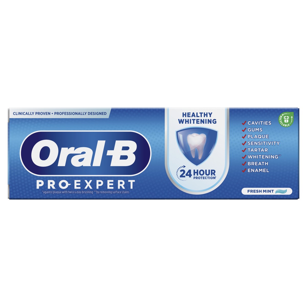 Zubna pasta Oral-B Pro-Expert Healthy Whitening klinički je dokazana i osmišljena u stručnoj suradnji sa stomatolozima, izbjeljuje zube uklanjanjem površinskih mrlja te pruža 24-satnu zaštitu od zubnih naslaga kada perete zube dvaput dnevno.